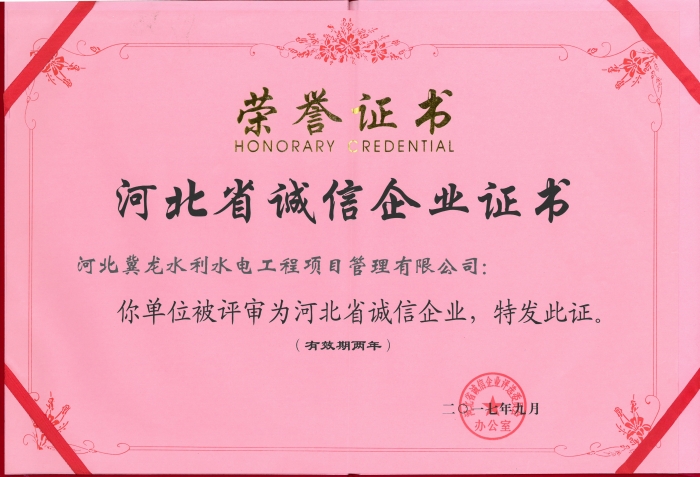 “誠信企業(yè)”是指經營狀況良好,誠信理念較強,誠信管理制度健全有效,積極履行社會責任,并取得較高認知度和良好信用記錄的企業(yè)。我公司堅持“守法、誠信、公正、科學”的企業(yè)監(jiān)理準則和“強化行業(yè)競爭意識,創(chuàng)優(yōu)質監(jiān)理品牌,鑄一流企業(yè)形象”的經營理念,形成了規(guī)范、完善的質量管理體系。2010年1月,公司通過了IS09001:2008質量體系認證,質量更有保障,讓業(yè)主更加放心。2017年7月18日公司通過了質量、環(huán)境、職業(yè)安全健康興原管理三體系認證,堅持以顧客為關注焦點,堅持持續(xù)改進,為職工和社會營造安全、健康的環(huán)境。公司多次榮獲“南水北調文明監(jiān)理單位”、“南水北調中線干線安全運行先進單位”、河北省南水北調工程建設監(jiān)理工作“優(yōu)秀單位”、“南水北調中線干線工程優(yōu)秀建設單位”等榮譽稱號。