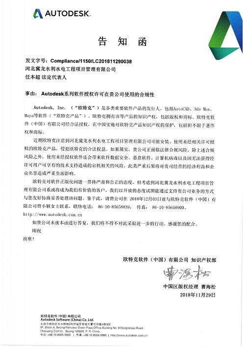 近期我公司收到以下告知函,請各駐地人員自查自糾,是否有安裝、使用未經(jīng)相關許可、授權的歐特克產品的行為,如有上述行為者盡快做相應處理。請大家互相告知。